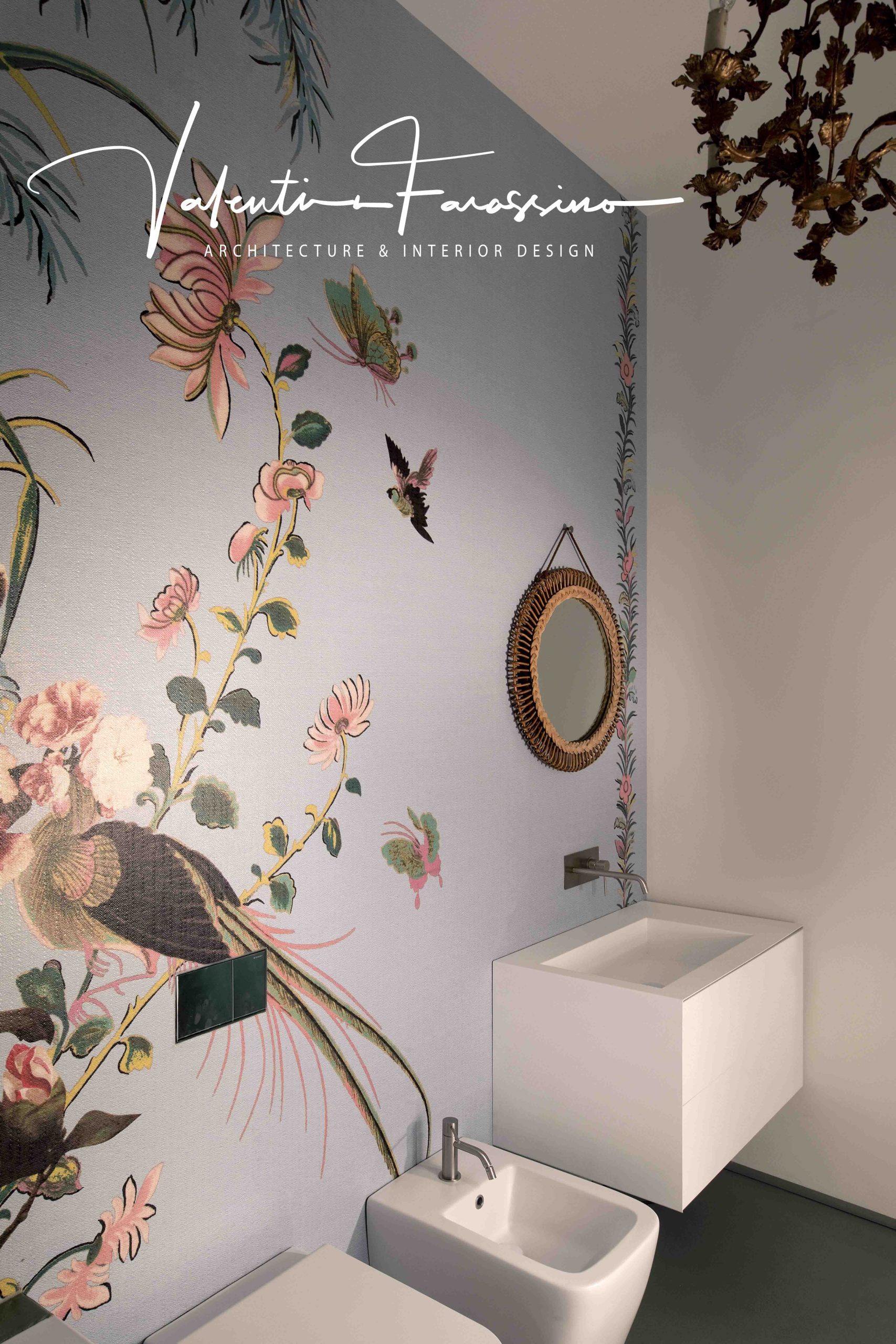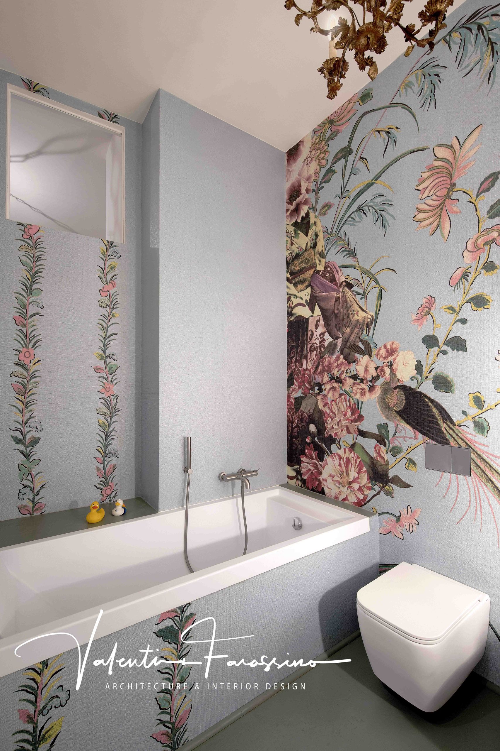 L’altro bagno, con richiami barocchi e di moda, porta sulle pareti una meravigliosa carta da parati disegnata da Antonio Marras.