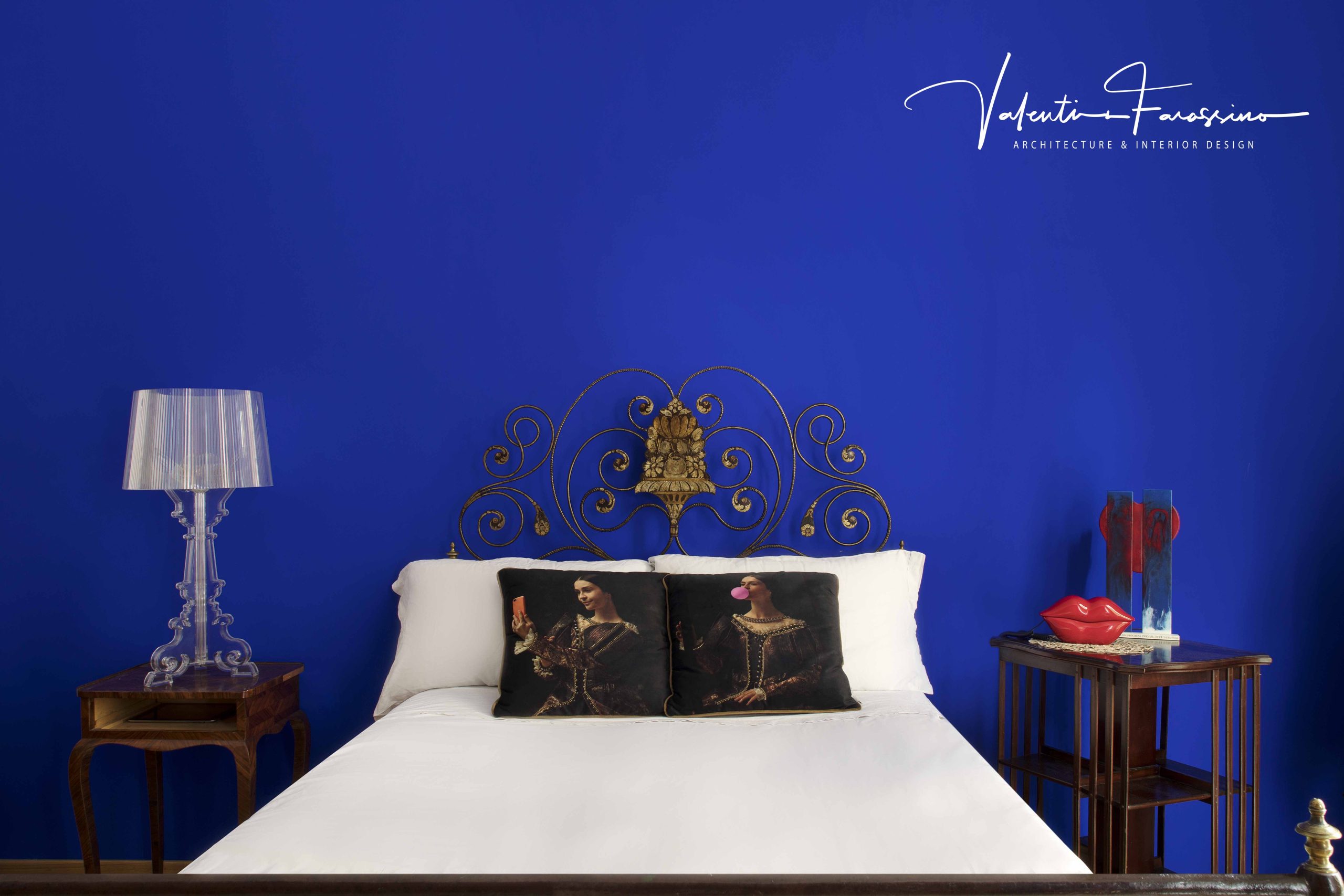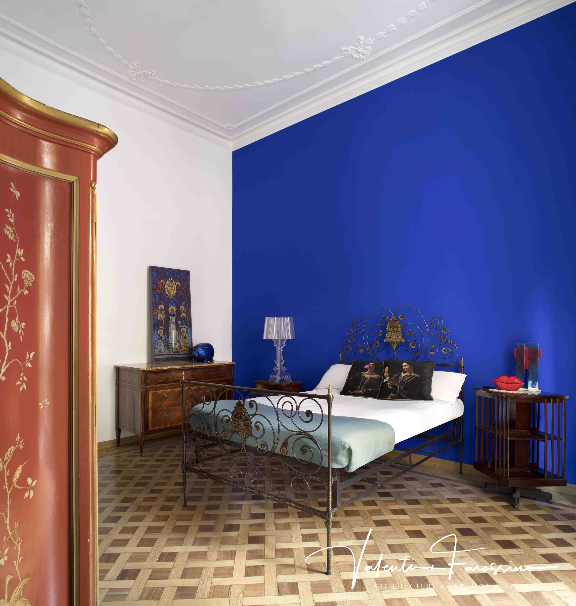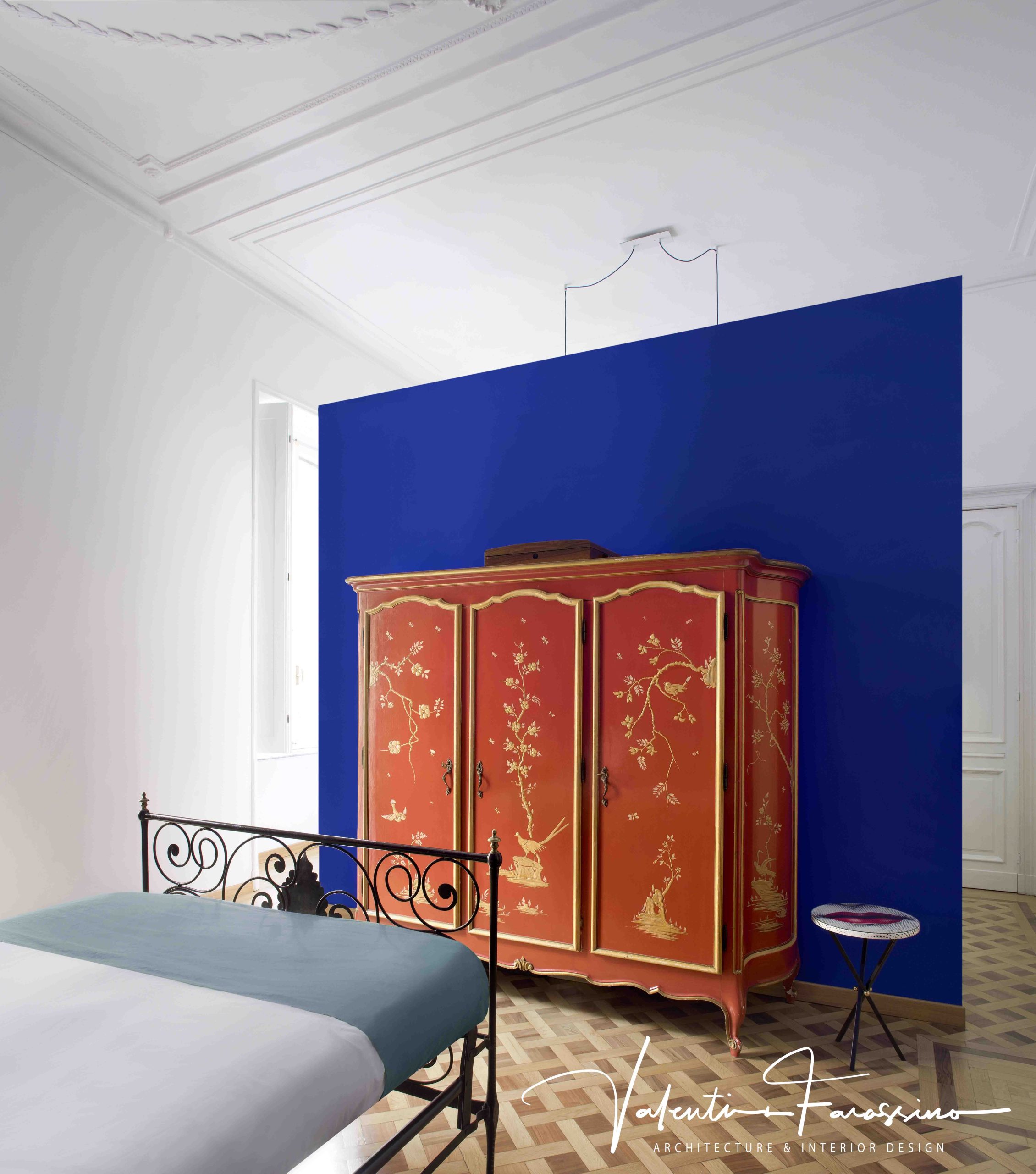 A volte, i progetti si sviluppano e trovano la loro riuscita migliore calcolando i centimetri. La cabina armadi è stata creata in camera da letto dove un setto Blu Klein divide gli spazi ed accoglie l’armadio laccato con cineserie.