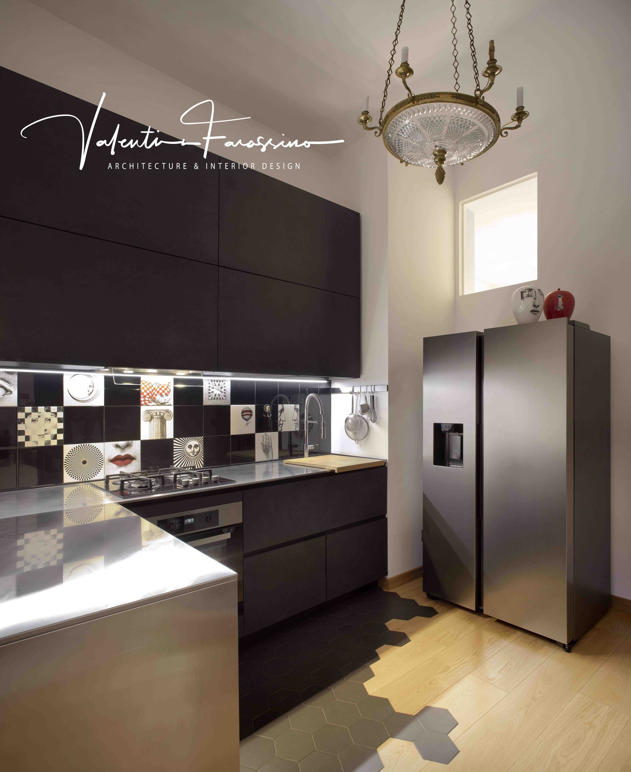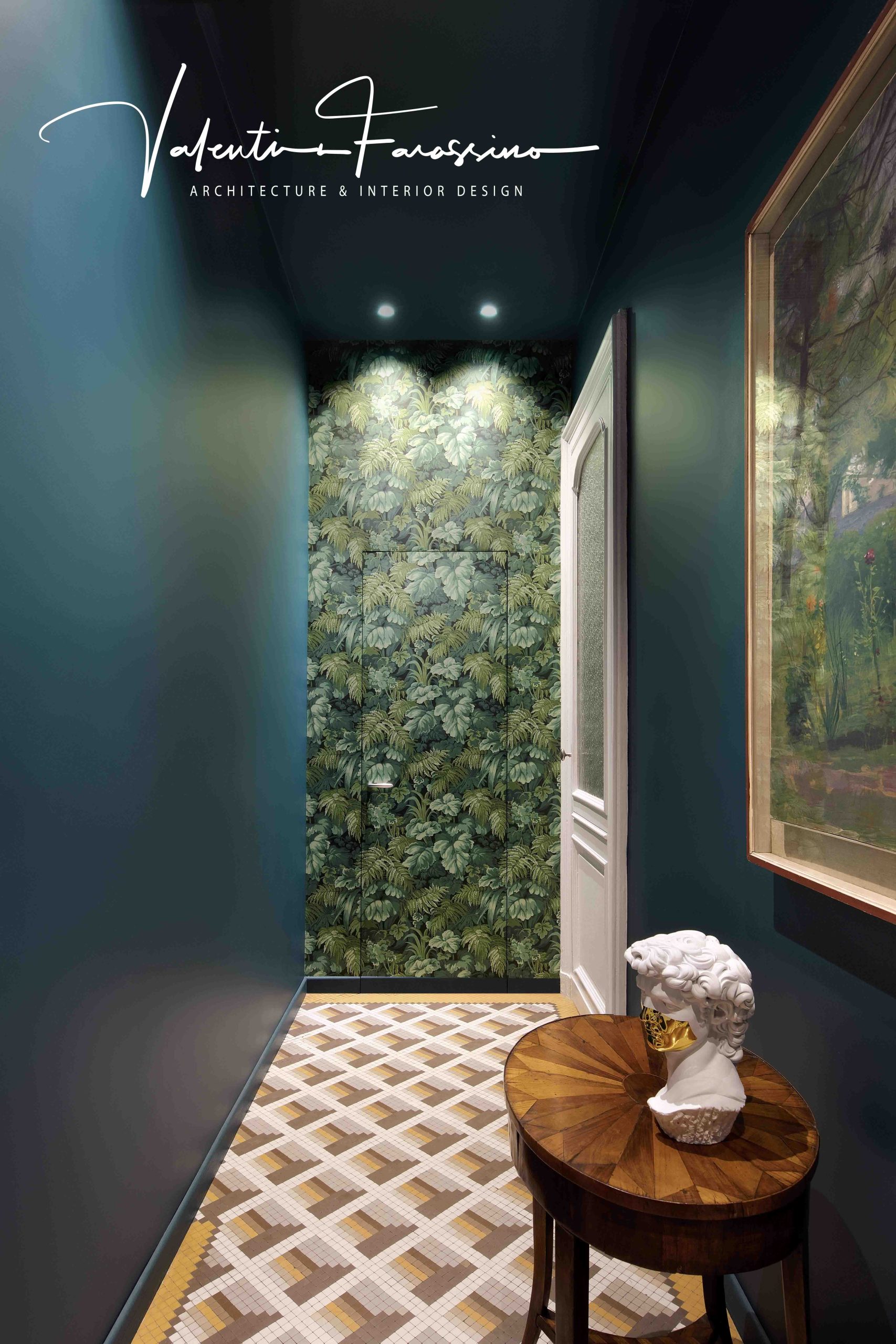 La porta di accesso al bagno diventa una parete nascosta, con una porta invisibile ed una stupenda carta da parati di Fornasetti.